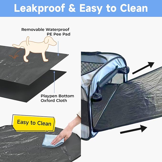 - 【Detachable Waterproof Pads for Hassle-Free Cleaning】: Puppy playpen features a detachable waterproof pet pee pads, making it simple to clean and ensuring your floors stay dry, ideal for pets of all sizes.