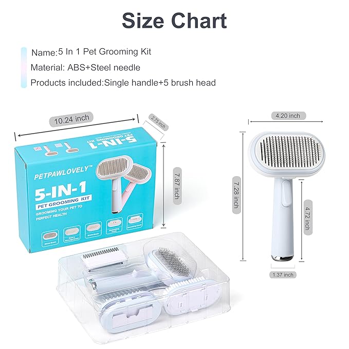 - 5 In 1 Cat Grooming Kit: This dog brush kit including 5 interchangeable brush heads:slicker brush;dematting comb(undercoat brush);deshedding comb;bristle brush;bath&massage brush.All cat hair brush are combined in one brush,no need buy more 5 different brushes
