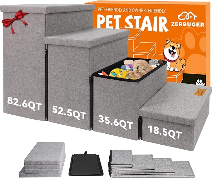 - 2-IN-1 DOG STAIRS WITH STORAGE: Zerbuger pet stairs not only provide a stable and cozy stair for your pet to climb, but also serve as a convenient large storage area total of 190QT for your pet's clothes, toys, or any other supplies. Our pet steps are covered with removable lids, Every steps are designed as storage boxes.