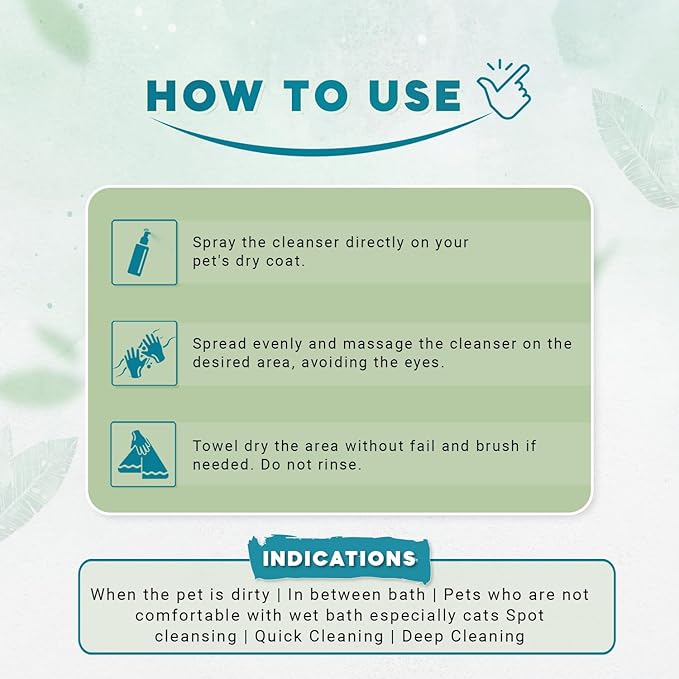 - ๐งด๐๐ฎ๐๐๐น๐ฒ-๐๐ฟ๐ฒ๐ฒ ๐๐ฝ๐ฝ๐น๐ถ๐ฐ๐ฎ๐๐ถ๐ผ๐ป: Simply spray onto your pet's coat, massage in, and towel dry. Ideal for busy pet parents who need a quick and effective cleaning solution.