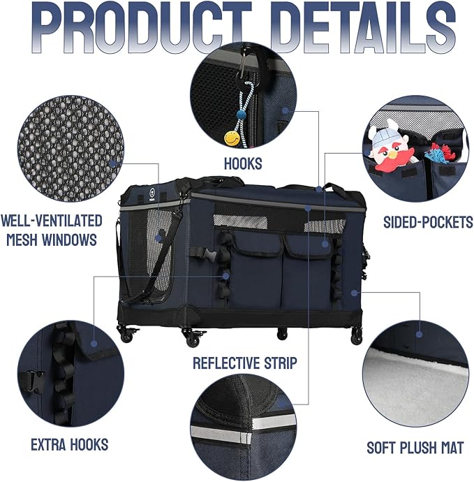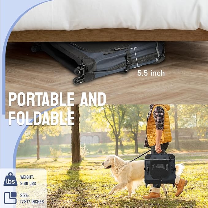 - _ASE OF ROLLING_he rolling travel dog crate with detachable wheels makes it easy for vet visits, long journeys, shopping, or walks ect.. The 360° rotating dual front wheels ensure smooth, quiet, and easy movement in any direction. Additionally, the rolling dog crate features the carrying handles and adjustable shoulder strap for convenient transport.