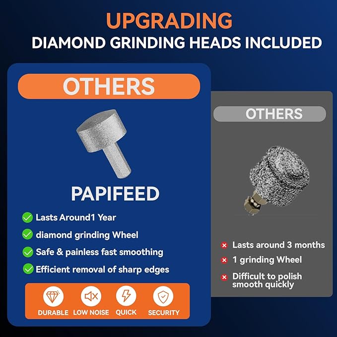 - EFFICIENT & PRECISE NAIL CARE: PAPIFEED has incorporated an advanced diamond bit grinder into its dog nail grinder for accurate and efficient pet claw grinding. With outstanding trimming results, our package includes two grinding wheels and a dog nail clipper, allowing you to tailor grooming to your pet's needs. This versatility enhances your pet's nail care experience.