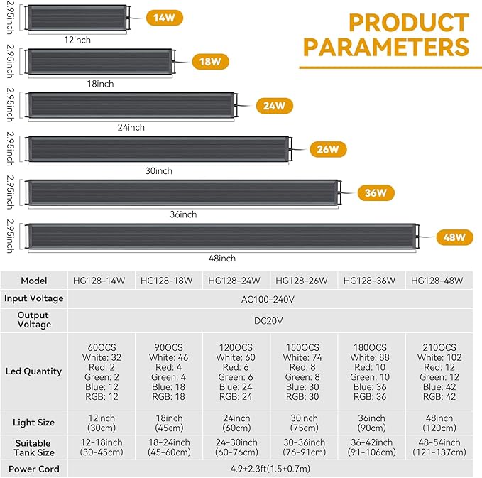 - 【5 Rows High-quality Lamp Beads】This Fish Tank Light features premium 5050 RGB Lamp Beads and 2835 Lamp Beads. The 36W is equipped with 180 LEDs: 96 pcs white LED, 6 pcs red LED, 6 pcs Green LED, 36 pcs blue LED and 36 pcs RGB LED. Compared with ordinary lamps, 5 rows of lamp beads provide wider and brighter lighting. Luminance: 6010lx