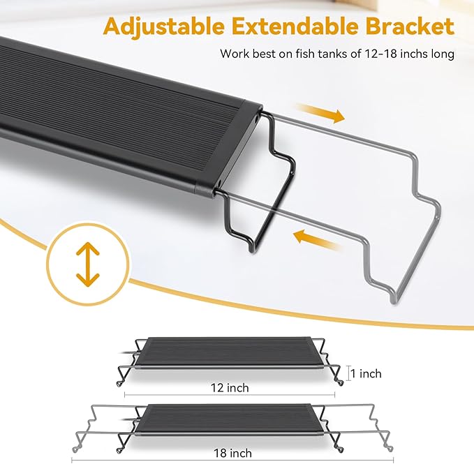 - 【Slim and Sleek & Long lasting 】Made of Aluminum alloy that provides a sturdy yet lightweight body. 1.2mm premium aluminum shell provides more effective heat transfer, long service life, can last up to 20000 hours of lighting. Size: The Light body without docking brackets is 12" L x 2.95" W. Its extendable bracket easily fits most 12-inch to 18-inch aquariums. It's easy to install on most glass or acrylic aquarium tanks with rims or rimless.