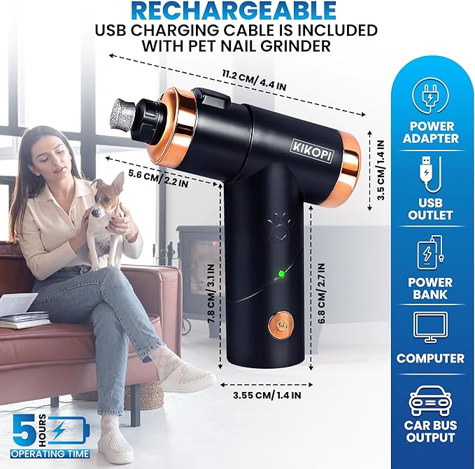 - Rechargeable - This cat and dog nail grinder has a green indicator light when charging, Charged via a USB cable, USB charging cable is included with pet nail grinder