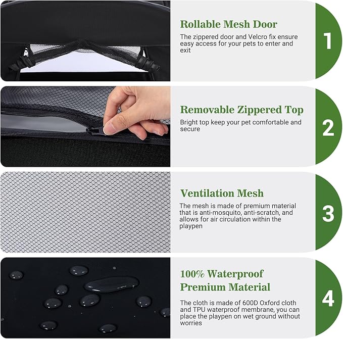 - Waterproof Foldable Pet Playpen: The pop up playpen is 100% waterproof, light weight and folds up, it can be put into a bag for convenient carry and storage. Perfect for travel, camping, picnic, or at the beach