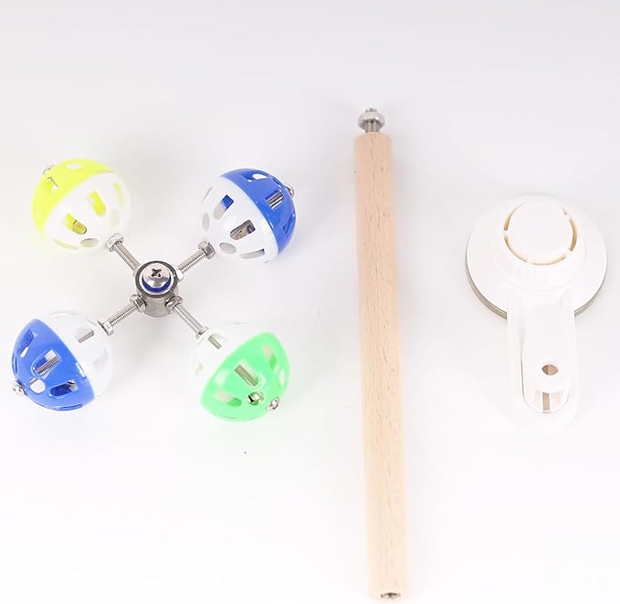 - Package Includes: 1 natural wooden perch stand,1 movable suction cup,1 spinning toy with rotating balls and bells inside