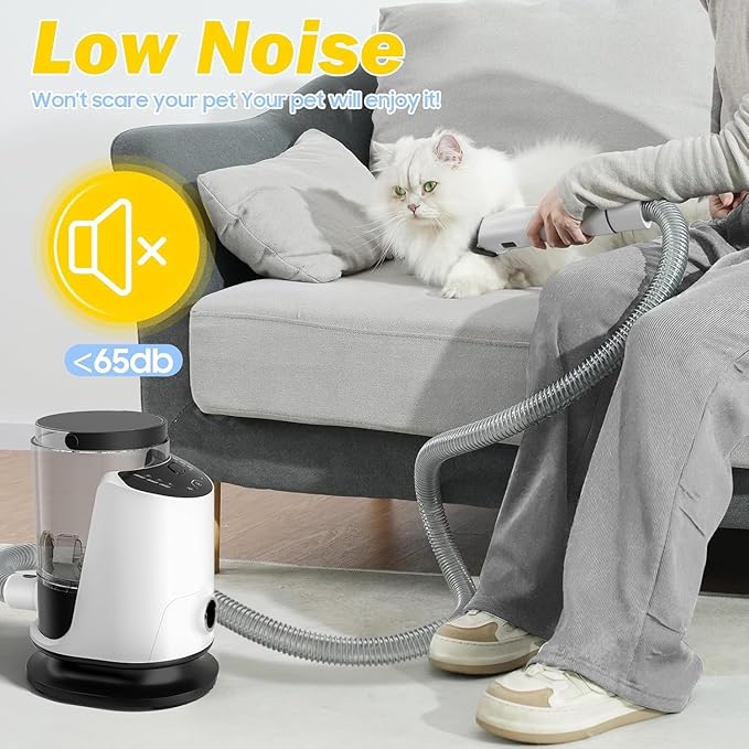 - Low Noise Design: Our pet grooming vacuum have a minimum noise level of less than 65 decibels, and we recommend brushing your pet's coat with our brush before trimming it, treating your pet with a small snack and avoiding stressing your pet with the noise of the vacuum cleaner, which will undoubtedly make the pet grooming experience more enjoyable.