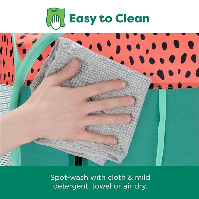 - PERFECT FOR TRAVEL: The playpen's pop-up design ensures that it can be set up, and put away, within seconds; the tent also comes with small metal stakes used to secure it to the ground, making it an ideal outdoor accessory for camping and picnics