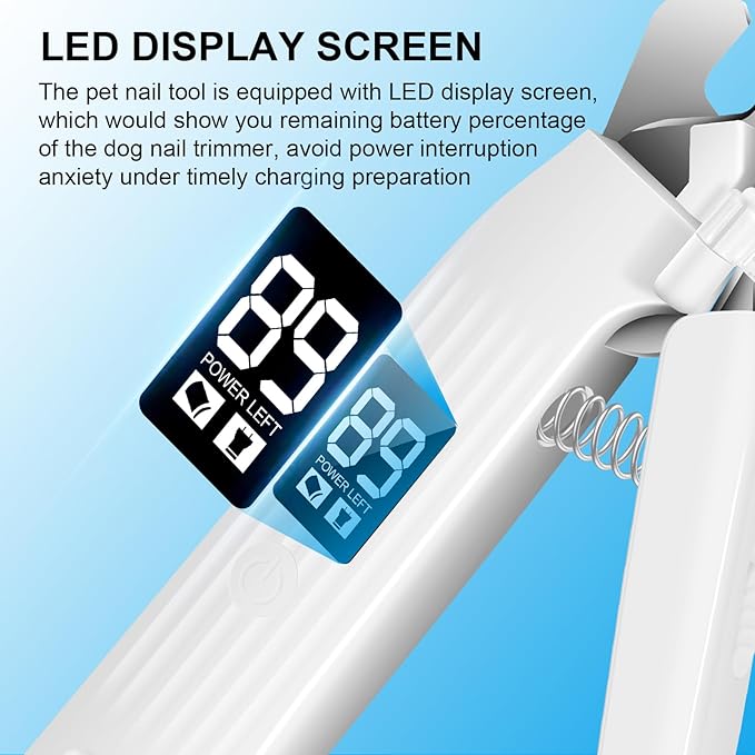 - LED Display Screen & Safety Lock: The pet nail tool is equipped with LED display screen, which would show you remaining battery percentage of the dog nail trimmer, avoid power interruption anxiety under timely charging preparation; Besides,the blade lock design of the 2-in-1 dog nail grinder and clipper could greatly prevent unwanted opening of the claw cutter by switching the side button on the pet claw nails clipper.