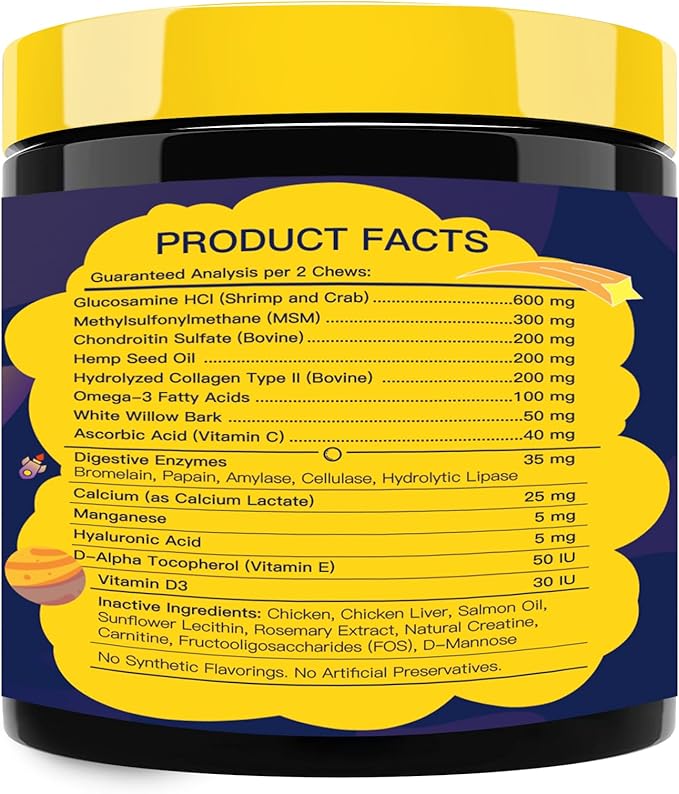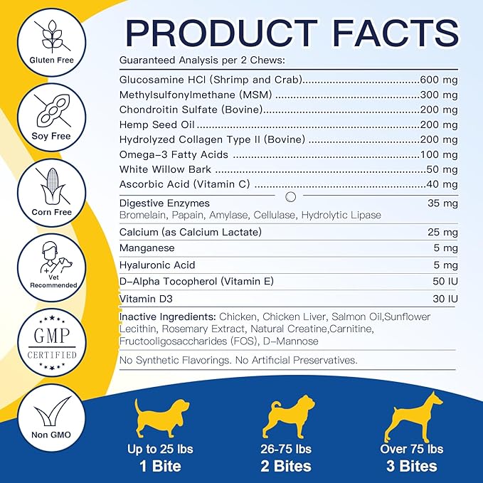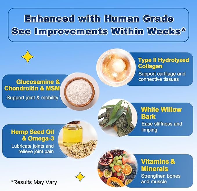 - UNMATCHED DOG JOINT SUPPLEMENT FORMULA: Our glucosamine chondroitin for dogs is expertly added with MSM, Omega 3 for dogs, Hemp, Collagen. Unlike those who only add high amount glucosamine, ours ensure your dogs receive mobility, cartilage, bone support