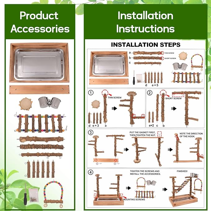 - Bird Toys: Includes bird swing and bird ladder. Birds don't like the same life, these bird toys can relieve the boredom of the parrot, enable the parrot to spend a fulfilling day in play, enhance psychological well-being, and maintain a stable and happy mood