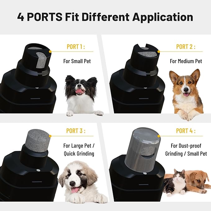 - [Multiple Ports for All Pet Sizes]: Designed for both cats and dogs, this trimmer includes multiple ports for different nail sizes. The large port is perfect for medium pets, while the detachable cover allows for fast grinding of larger pets' nails, ensuring smooth, precise trimming every time.