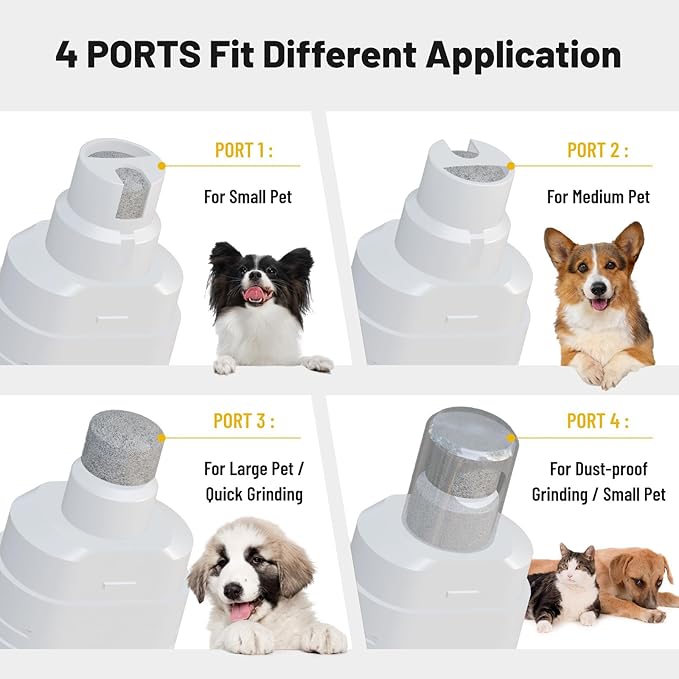 - [Multiple Ports for All Pet Sizes]: Designed for both cats and dogs, this trimmer includes multiple ports for different nail sizes. The large port is perfect for medium pets, while the detachable cover allows for fast grinding of larger pets' nails, ensuring smooth, precise trimming every time.