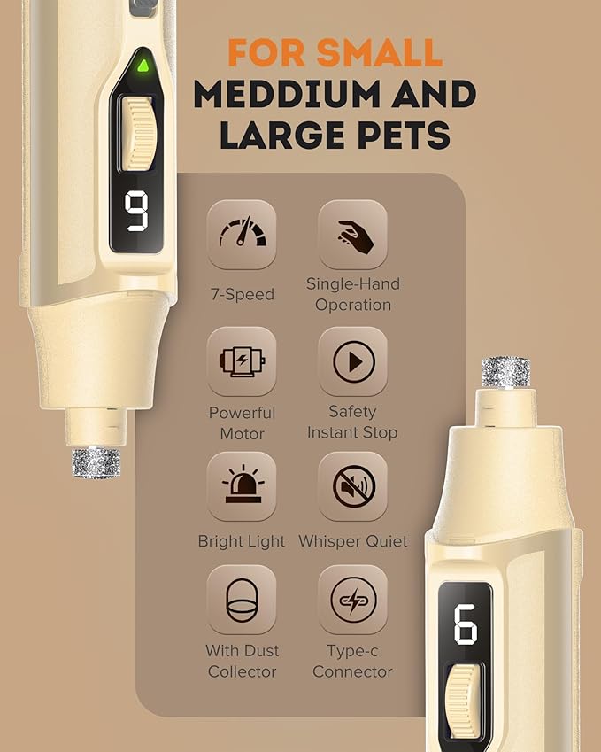 - 7 SPEEDS ADJUSTABLE: Ranging from 8,000 to 15,000 RPM, as one of the most powerful grinders, ideal for trimming the nails of small, medium, and large dogs, cats, birds, and other small animals