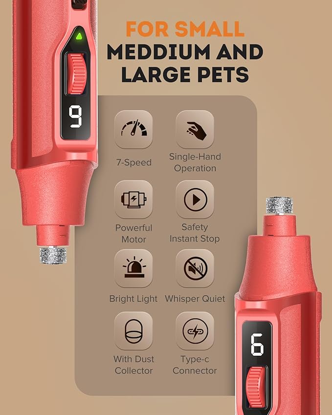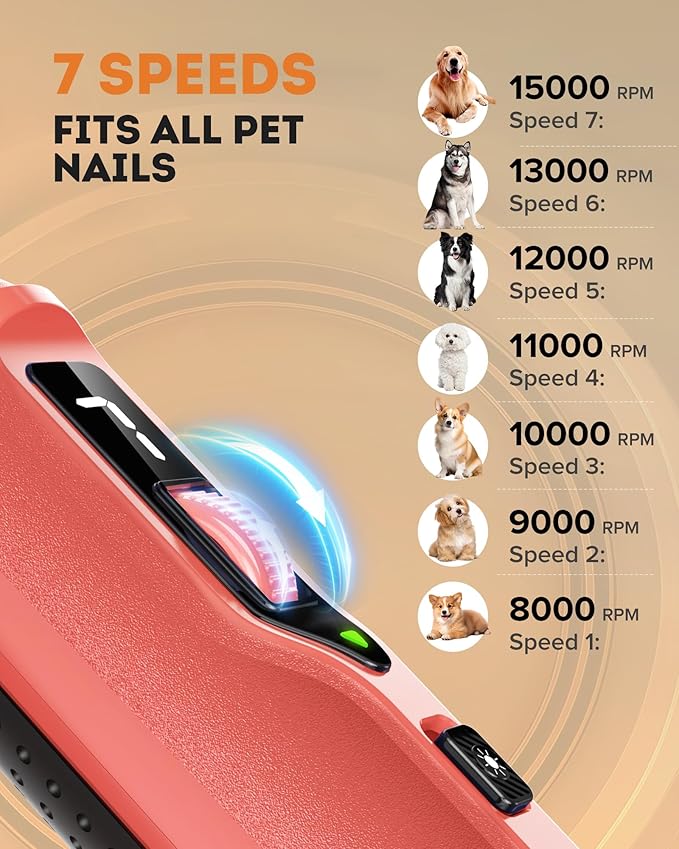 - 7 SPEEDS ADJUSTABLE: Ranging from 8,000 to 15,000 RPM, as one of the most powerful grinders, ideal for trimming the nails of small, medium, and large dogs, cats, birds, and other small animals