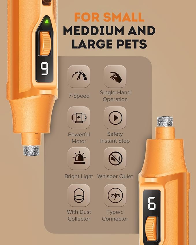 YABIFE 7-Speed Dog Nail Trimmers, Professional Dog Nail Grinder with Light - Heavy Duty Pet Nail Grinder for Dogs/Cats/Birds/Small Animals - Whisper Quiet, Single Hand Operation
