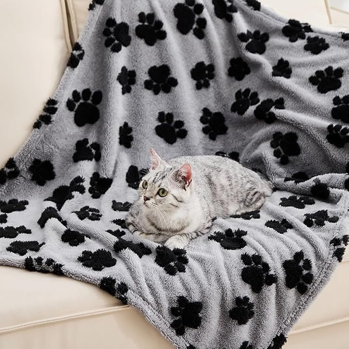 Qeils Jacquard Dog Blankets for Small Dogs, Cozy Calming Blanket for Indoor Cats, 280GSM Coral Fleece Plush Fluffy Throw Blanket, Black Paws, 25x30IN
