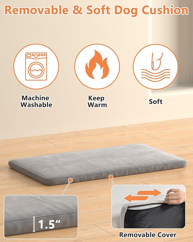 - _og Crate with Cushion Imagine your furry child in this dog crate with a specially customized mat that is like a warm blanket for his cot for the cold nights. This mat is removable for machine washing and very easy to clean. The bottom of this dog crate is made of sturdy wooden boards, so you don't have to worry about your dog's little feet getting stuck in the crevices at all, so that your baby can sleep more peacefully.