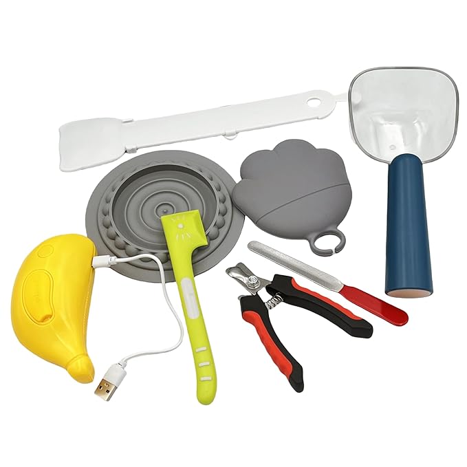 • COMPLETE KIT: 8-piece pet grooming set includes steam brush, nail clipper and file, food scoops, can lid cover, and slow feeder bowl for dogs and cats.