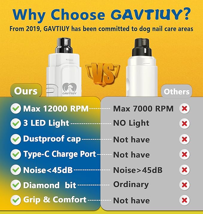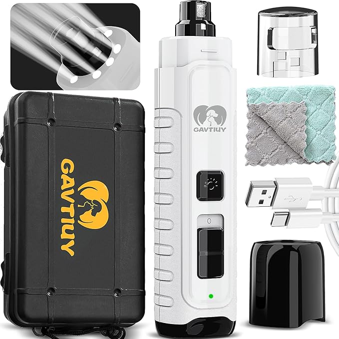 - 【Low Vibration & Working Noise】:Comes with special light weight diamond bit that produces a very low vibration and faster speed,will deliver the most comfortable pet claw grinding.Additionally,Gavtiuy dog nail grinder comes with a clear dust cap,it can also collect nail ash,offering your pet a comfortable and relaxing grooming experience