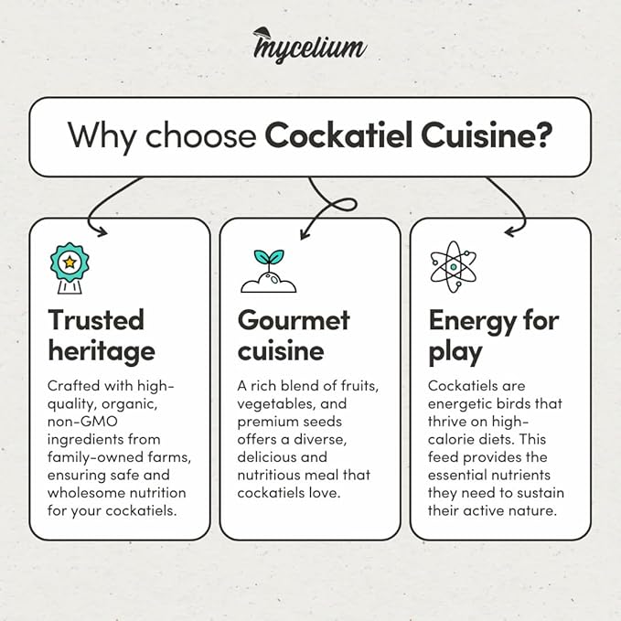 Mycelium Cockatiel Cuisine Bird Food | 5 lb Premium Seed Mix with Vegetables, Fruits, Sunflower Seeds, Oat Groats & Buckwheat for Energy, Digestion, and Feather Health | Organic & Non-GMO