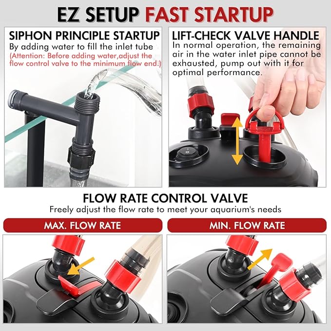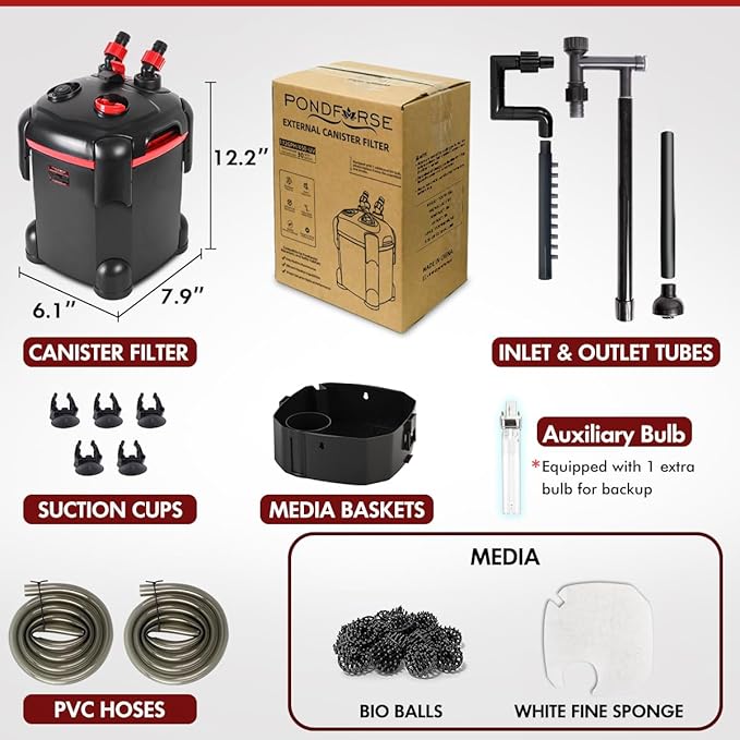- 【Efficient Filtration Capabilities】The PondForse canister filter utilizes multiple layers of filtration media to remove particles, excess nutrients, and impurities from the aquarium water. This comprehensive approach to water purification helps maintain crystal-clear water and a healthy ecosystem for your aquatic pets.