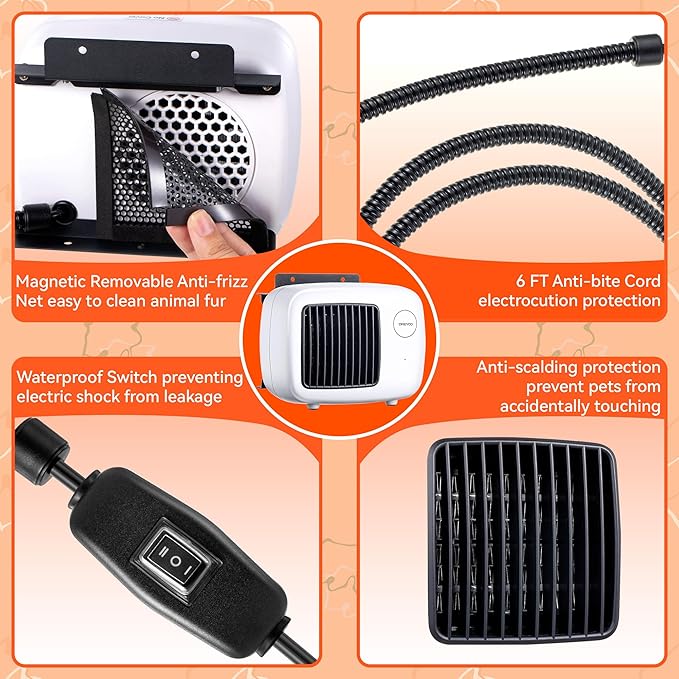 • Easy to Install and Clean: independent safety bracket makes the heater easy to install in the dog house; Only 3 steps: 1. Find a position taller than your pet; 2. Drill hole; 3. Hang the heater; Then you can let your pet enjoy a warm winter; Meanwhile, the magnetic removable hair guard on the back of the heater makes it easy to clean your pet's hair and dust without removing the heater, convenient for daily use