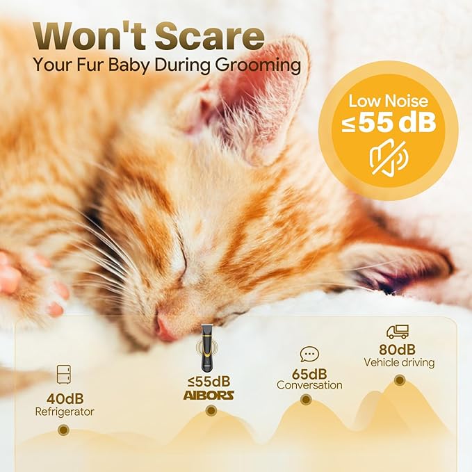 - Quiet Dog Hair Clippers: The pet grooming trimmer are equipped with advanced motors and silent technology, with fast speed and low vibration. The noise is about 55db when trimming, ensuring that your pet is comfortable throughout the grooming process and will not scare your furry baby. Their hair can be trimmed to the right length with steel scissors and combs, and then the electric trimmer can be used for body trimming to avoid pulling