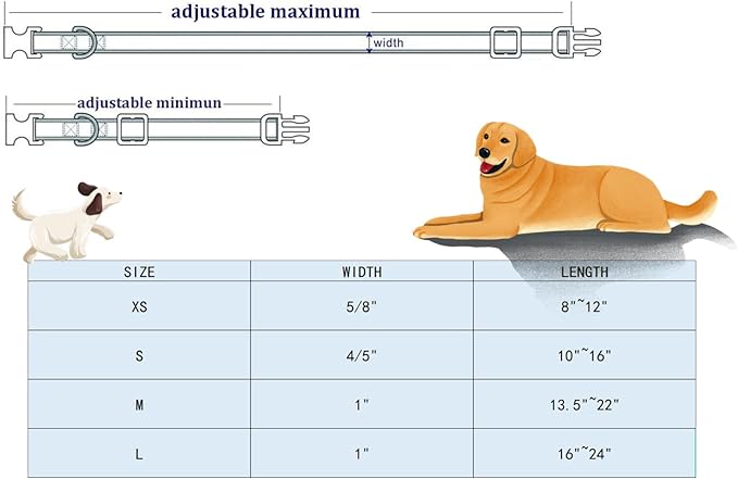 - Collar SIZE: XS Collar (Width : 5/8"Length : 8-12"). S Collar (Width : 4/5" Length : 10-16"). M Collar (Width : 1" Length : 12-22"). L Collar (Width : 1" Length : 16-24").
