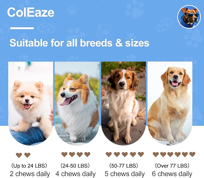 - All-Life-Stage Joint Care: Whether your furry friend is a playful puppy or a wise senior, our dog joint supplement offers age-appropriate support. Formulated with glucosamine for dogs, it strengthens growing joints in young dogs and eases aging hips in older pups. A hip and joint chew for dogs that grows with them!