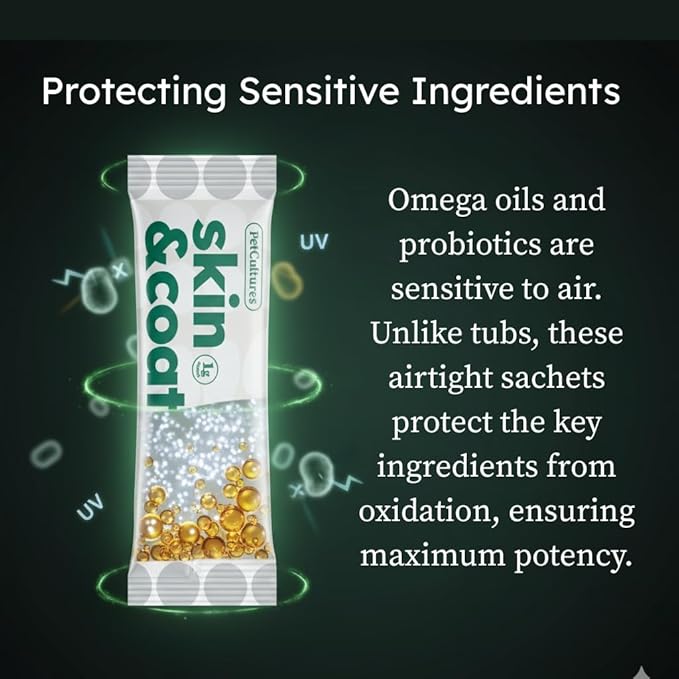 Petcultures Skin & Coat TriBiotic Formula | Powder Food Topper Supplement, Not a Treat with Probiotic, Prebiotic and Postbiotic | with Omegas, Biotin & Zinc for Skin Vitality | 30 Packs | Made in USA