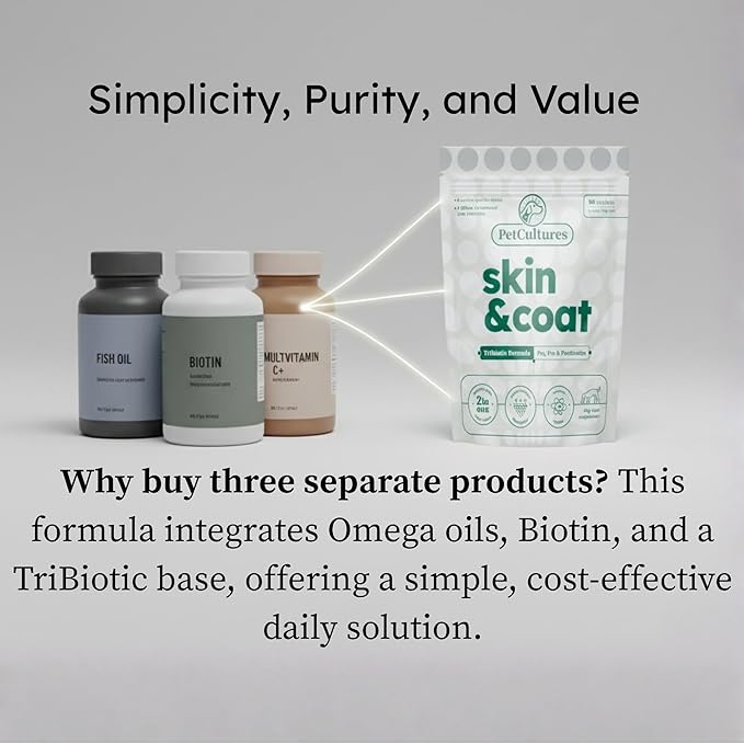 - A PROACTIVE INVESTMENT & 2-IN-1 VALUE: This is more than just pet probiotics for dogs; it's a complete skin and coat solution. Our 2-in-1 formula combines Omega 3 & 6, Biotin, Zinc, & Vitamin E with a full 3-in-1 TriBiotic base. To get this composition from other brands, you would need multiple products, making our formula a cost-effective choice.