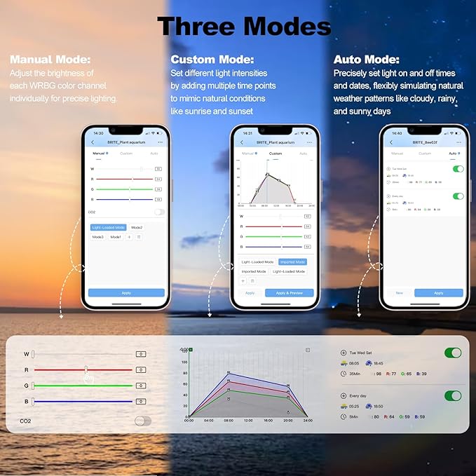 - Manual/Auto/Custom 3 Modes: The plant aquarium light offers Custom Mode, allowing you to set up to 24 time points for a personalized sunrise and sunset cycle. Auto Mode lets you schedule light simulate dynamic weather conditions such as cloudy, rainy, or sunny days, creating a natural environment in your tank. Manual Mode provides precise brightness and color adjustments
