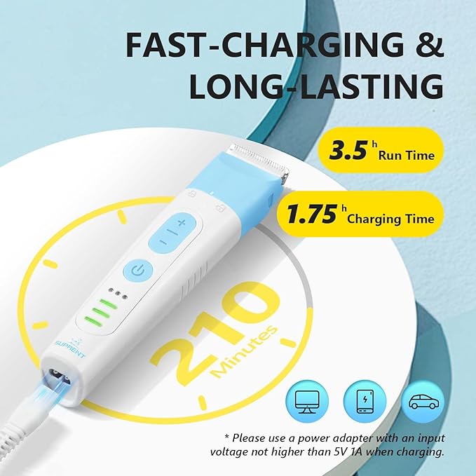 - 【PERFECT FOR BEGINNERS】SUPRENT professional dog grooming clippers offer 3 adjustable speeds (5500/6500/7500RPM), allowing you to tailor the trimming experience to your pet's noise tolerance and hair thickness. Equipped with 2 attachment guide combs (3/4&5/6mm) for the hair clipper and one guide comb (2mm) for the paw trimmer, you have full control to customize and adjust the length of your pet's hair with ease.
