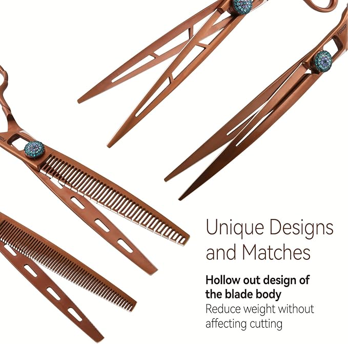 - 💎[Fashion Design and Matching] The dog grooming scissors adopt vacuum electroplating titanium alloy technology, chocolate color, primitive simplicity, elegant, and stable. High precision CNC screws with blue artificial diamonds embedded on the surface, like the eyes of God, dynamic and energetic. Every time you open and close the FOGOSP dog scissors, it feels silky smooth like enjoying chocolate.