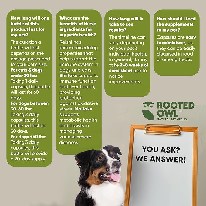 - A NATURAL IMMUNITY BOOST FOR YOUR PET: Boost your pet’s immune system with Rooted Owl Natural Immunity mushroom supplement for dogs and cats, a triple blend of Reishi, Shiitake and Maitake mushrooms for dogs and cats, plus antioxidants and vital nutrients that help fortify defenses and reduce inflammation*