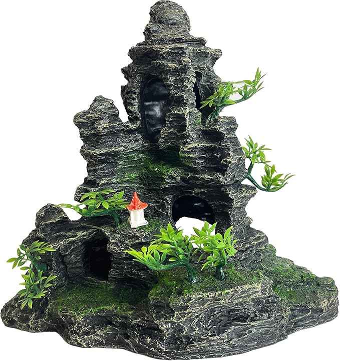 - Compatible size: the extra large aquarium mountain decoration is about 10.3 in(L) x 5.8 in(W) x 11 in(H);it comes with small artificial plants and the small red pagoda to aid in landscaping,fish can hiding behind their leaves, making funny together; the aquarium decor provides several rock cave,which allows small fish to play and rest blithely in and around it; it is suitable for middle and Large aquarium landscaping