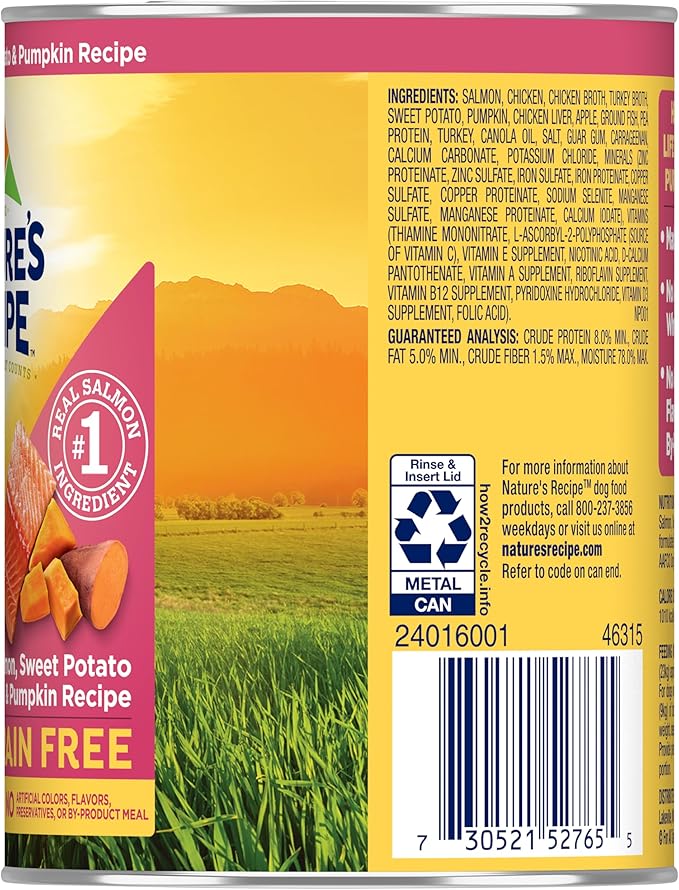 • CANNED WET DOG FOOD: Contains twelve (12) 13-ounce cans of Nature’s Recipe grain free wet dog food with salmon, sweet potato and pumpkin