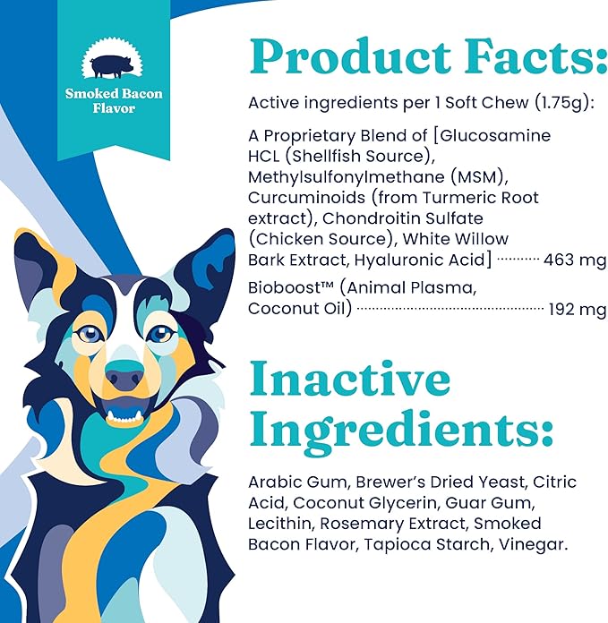 - Cartilage & Bone Support for Dogs - With a smoked bacon flavor that your dog will love, this glucosamine for dogs hip and joint supplement also helps support normal bone and cartilage health for dogs