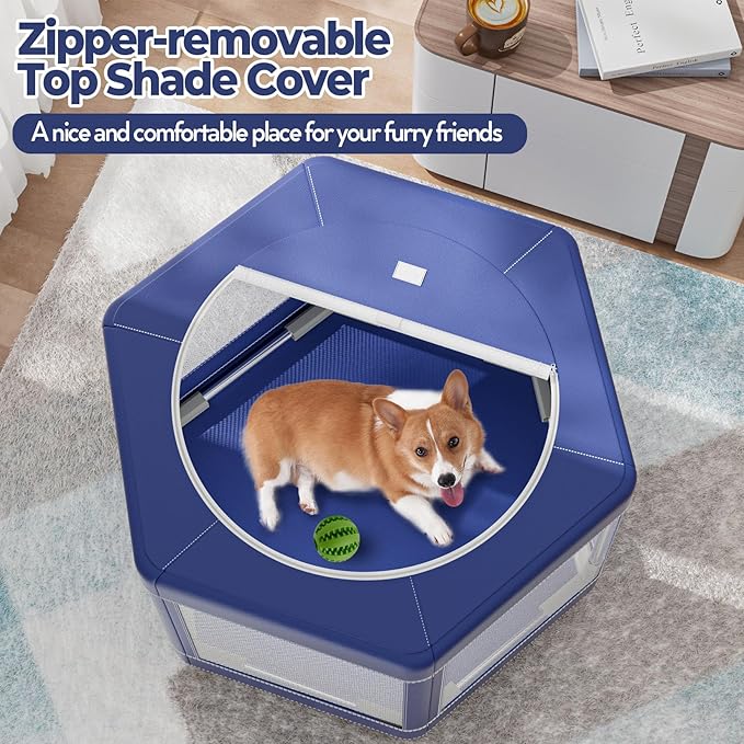 - 🐶『Superior Breathable Oxford Fabric』- Our puppy pet playpen is made from high quality thickened waterproof 600D Oxford cloth, the mesh is made from high-strength nylon wire, which have strong abrasion resistance and toughness. Offers exceptional breathability, even on hot summer days, your puppy won't feel stuffy inside the enclosure.( Top cover can open )