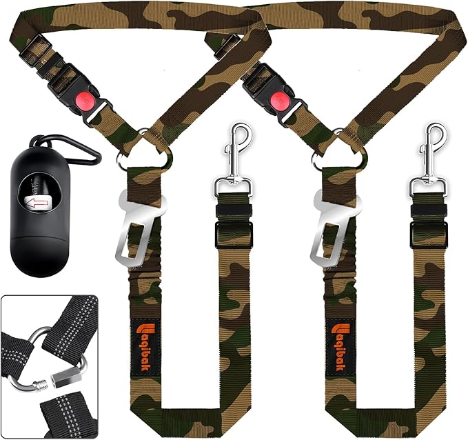 Removable Dog Seat Belts Harness for Car, 3 in 1 Pet Dog Car Seatbelt Leash, laqibak Restraint Secures to Headrest and Reflective Effect Adjustable Bungee Dog Seatbelt Tether, 2PCS and Poop Bag Holder
