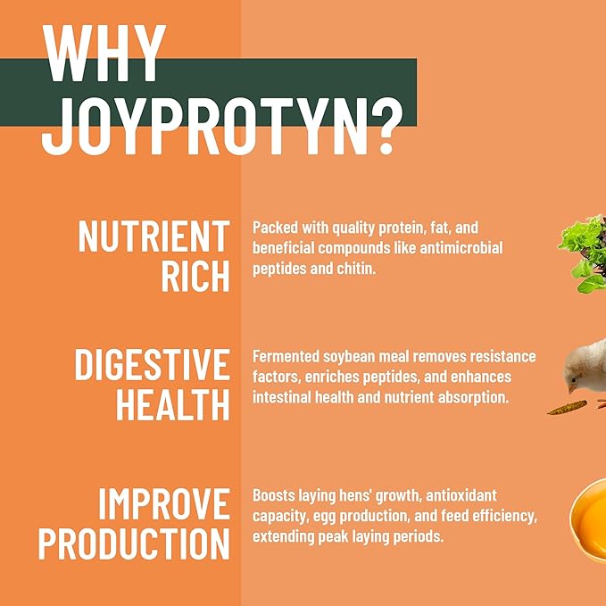 - Worry-Free After-Sales Service: At Joyprotyn, your satisfaction is our priority. Each 5LB bag provides ample supply for your flock, and if you’re not fully satisfied with our premium BSFL feed, our dedicated customer service team is here to ensure a solution. Enjoy peace of mind with Joyprotyn’s high-quality, nutritious feed for worry-free feeding.