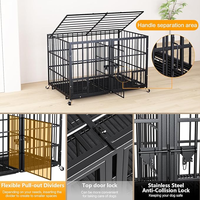42 Inch Metal Dog Crate for Large Dogs,Heavy Duty Dog Cage Kennel Indoor with Divider Panel, Lockable Wheels, Indestructible Drop Cages for Dogs with Removable Tray, Escape Proof Locks