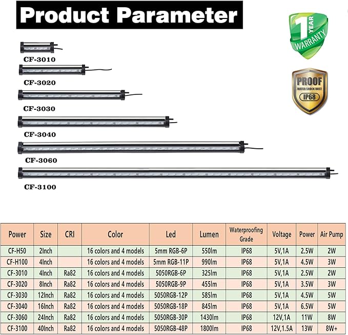 Carefree Fish Aquarium 4/8/12/16/24/40In Led Nanometer Materials Air Stone Strip Ⅱ and Tube Fish Tank Oxygen Stone Bubble Wall RGB Light Waterproofing Grade IP68(Air Pumps not Included