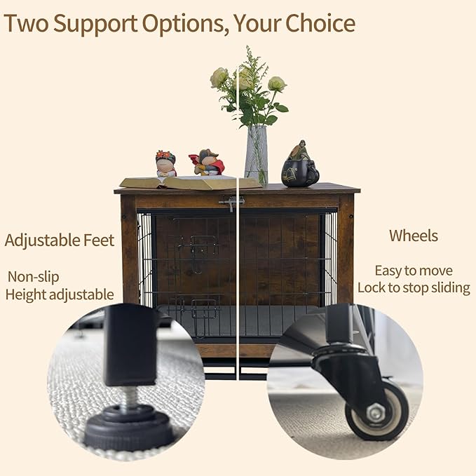 - 360Β° πΎπππππ ππ π¨π ππππππππ ππππ: This dog kennel furniture indoor offers two installation options.360Β° rotating wheels for easy movement, with locks to secure it in place, or adjustable feet to compensate for uneven surfaces and keep the crate stable.