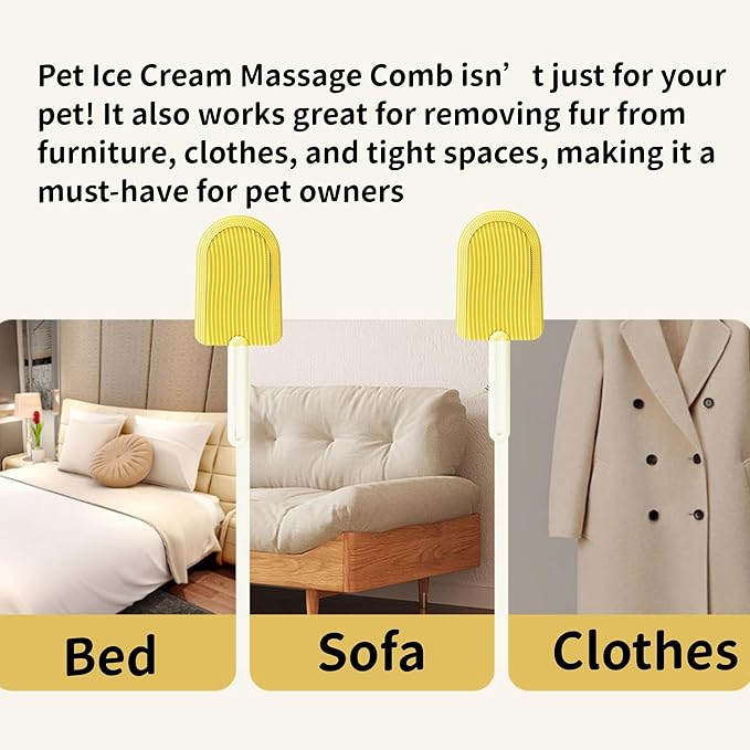- Versatile Grooming Comb: Pet Ice Cream Massage Comb isn’t just for your pet! It also works great for removing fur from furniture, clothes, and tight spaces, making it a must-have for pet owners.Enjoy a tidier living space and quality bonding time with your pet