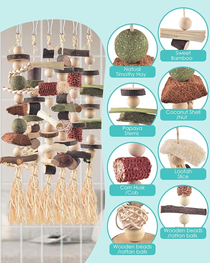 - Natural Materials: DBNESS small animal toys are crafted from 100% natural materials including apple wood, timothy hay, loofah slices, rattan balls, nuts, corn husks/cobs, coconut shells, sweet bamboo, and papaya stems. These bunny toys for bunnies provide safe play and chewing opportunities for your lovely pets. These materials are not only fiber-rich, which helps clean your pet's teeth and promote digestion, but they also aid in exercising and relieving stress