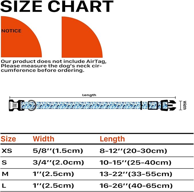 • Adjustable Wide Range of Sizes: XS: 5/8"W, Length 8"-12"; S: 3/4"W, Length 10"-15"; M: 1"W, Length 13"-22"; L: 1"W, Length 16"-26", Please measure the circumference of your dog's neck before purchasing