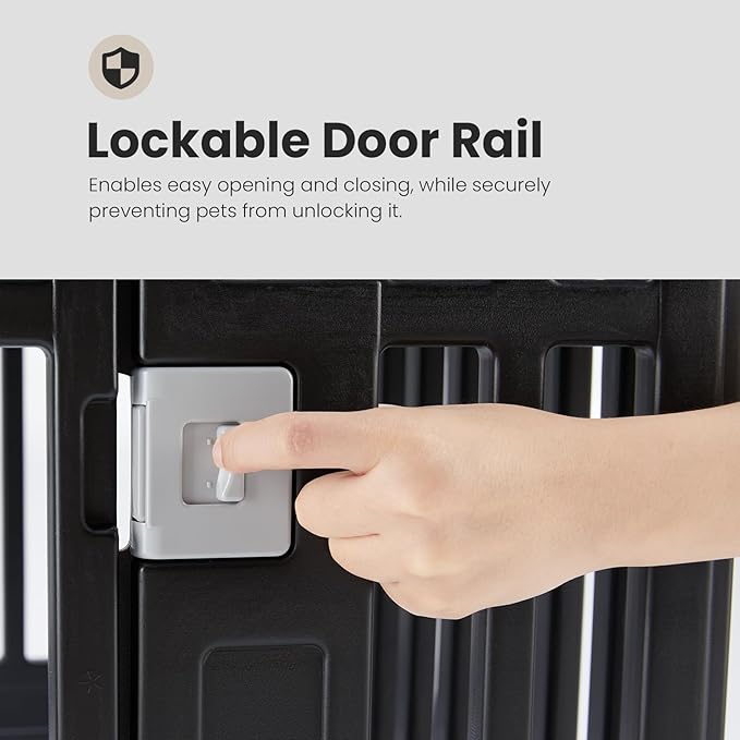 - Enhanced Safety and Durability: Thoughtful features like a sliding lock mechanism ensure the gate remains pet-proof, while the small door design allows pets to exit freely without requiring lifting. The 4cm spacing between bars prevents pets from sticking their heads through, enhancing safety. Constructed using advanced blow molding technology, the playpen boasts thicker, sturdier panels that resist deformation, ensuring long-term stability and durability.